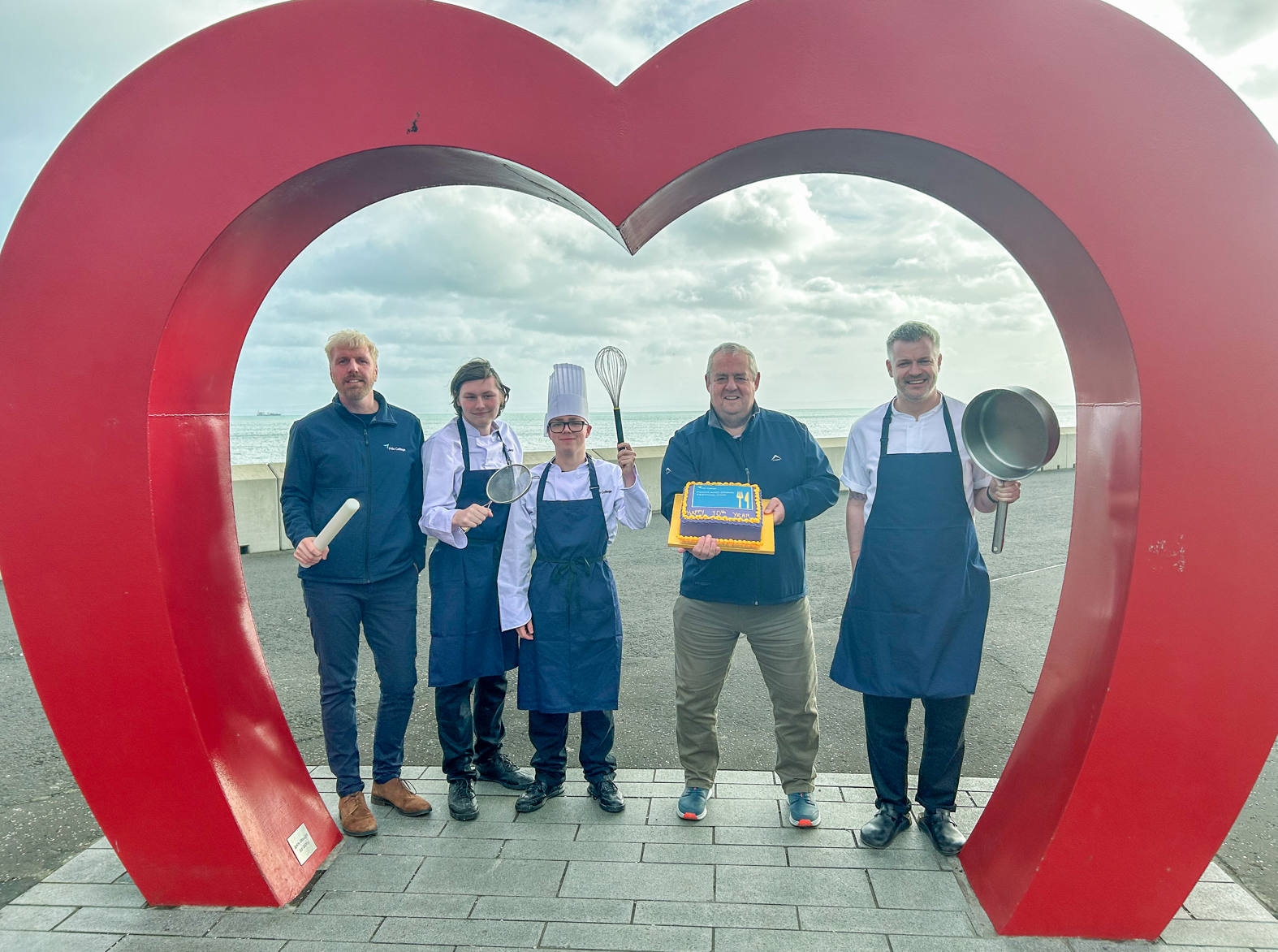 Photograph attached (l to r): Barry Scott, Curriculum Manager, Department of Culinary Arts, Hospitality and Events at Fife College, Kain Duffy and Leroy Davis, both students on the Intermediate Certificate: Bakery Level 5 at Kirkcaldy Campus who helped bake the Food and Drink Festival anniversary cake, Bill Harvey, former manager of Kirkcaldy 4 All and one of the founders of the original Fife College Food and Drink Festival and Eadie Manson, Culinary Arts Lecturer at Fife College are pictured on the Kirkcaldy Promenade.