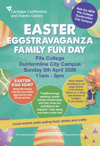 Families across Fife are invited to hop along to a fun-filled day of Easter celebrations at Fife College’s Carnegie Conference and Events Centre this weekend.