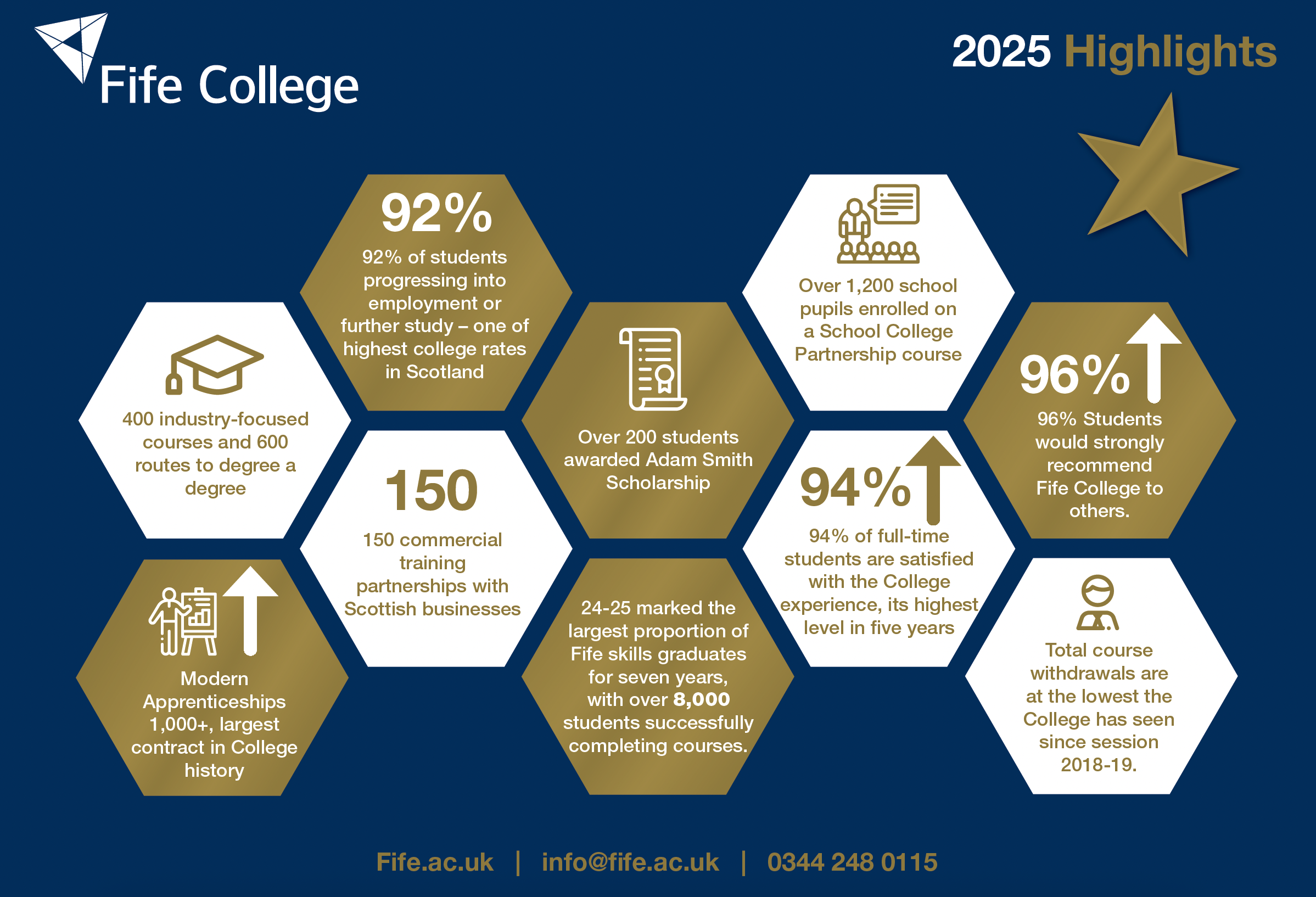 - Modern Apprenticeships Boom: The College secured the largest modern apprenticeship contract in its history for 2025-26 (worth £2.5m). More than 1,200 apprentices will be earning and learning with Fife College during 2025-26 in key industry skills vital to the regional economy including defence, construction, healthcare and hospitality.