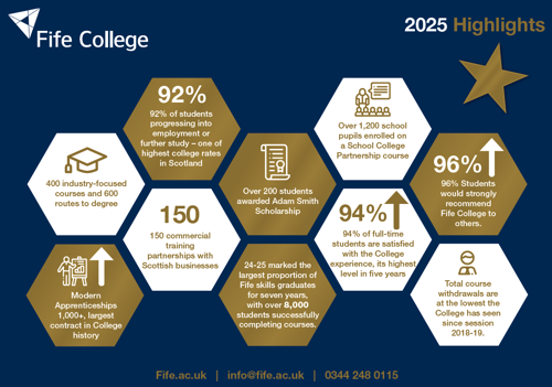 - Modern Apprenticeships Boom: The College secured the largest modern apprenticeship contract in its history for 2025-26 (worth £2.5m). More than 1,200 apprentices will be earning and learning with Fife College during 2025-26 in key industry skills vital to the regional economy including defence, construction, healthcare and hospitality.
