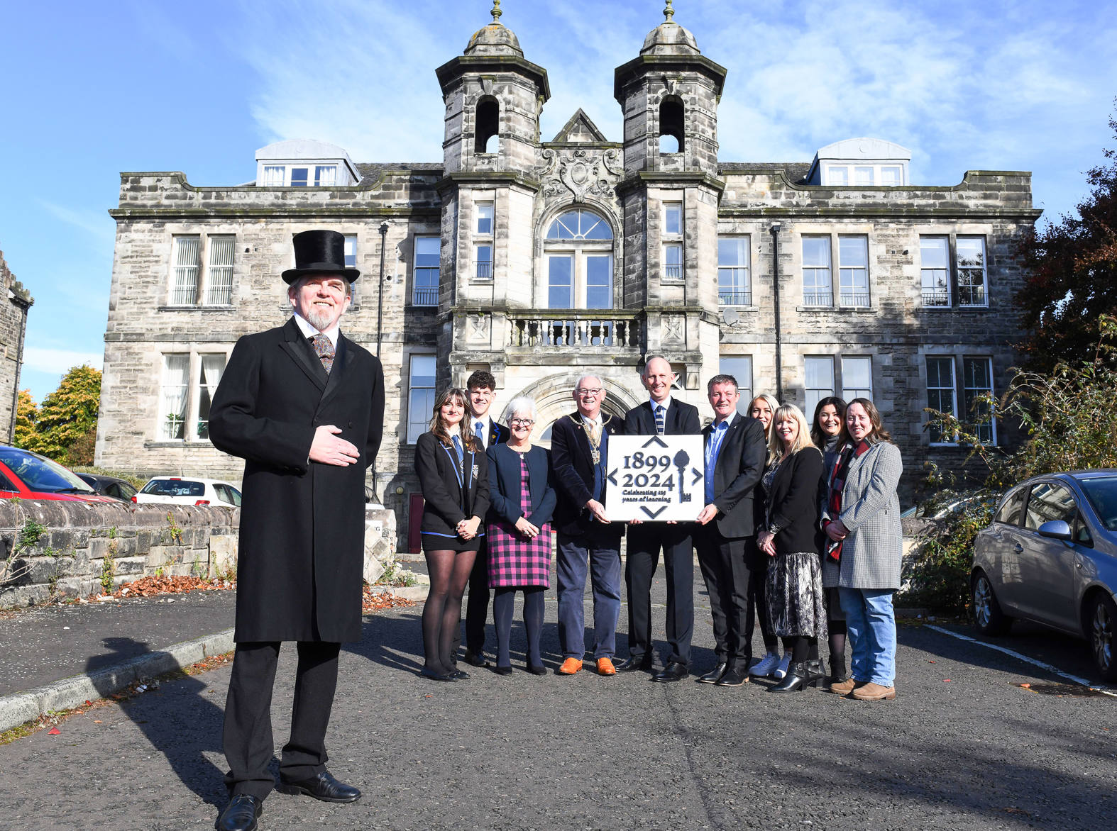 Photograph: Front left, actor Tomm Campbell, ‘George Lauder’, (group left to right) Tegan Brooksby, Woodmill HS School Captain, Matthew L’Anson, Woodmill HS School Captain, Janet McCauslin, Chair of Carnegie Dunfermline Trust, Jim Leishman, Provost of Fife, Jim Metcalfe, Fife College Principal, Iain Hawker, Assistant Principal – Enterprise & Partnerships at Fife College, Megan Simpson George Lauder Bursary recipient, Lyn Gold, Scholarships and Alumni Lead at Fife College, Julia Sherriffs George Lauder Bursary recipient, and Niamh Hogwood, George Lauder Bursary recipient are pictured at the old Lauder Technical School building in Skibo Court, Dunfermline on the 125th anniversary of Fife College. Credit: David Wardle