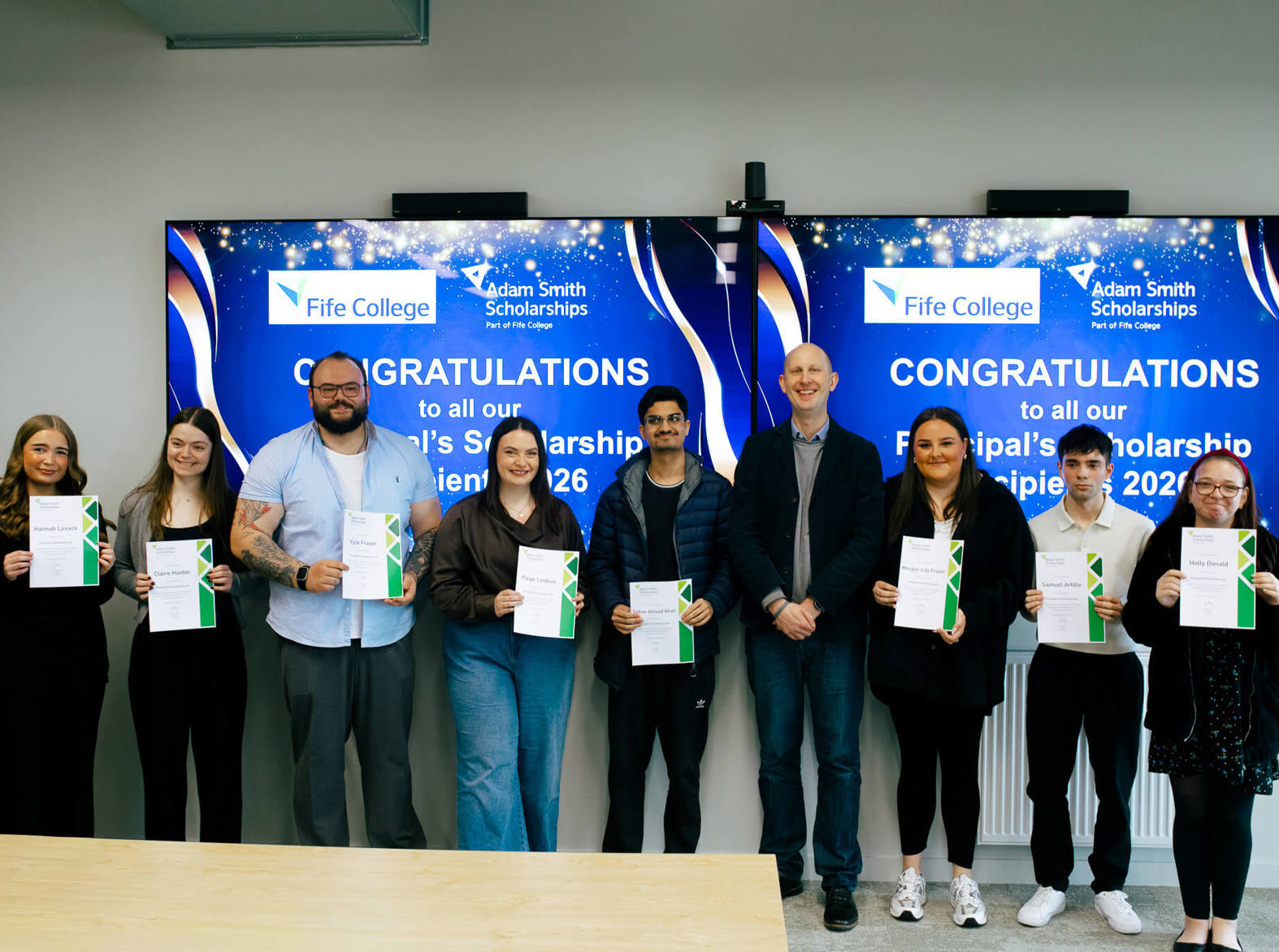 Photograph attached: Principal’s Scholarship winners 2026 are pictured with the Principal, Jim Metcalfe, at Fife College’s Dunfermline City Campus (left to right): Hannah Levack, Claire Hunter, Kyle Fraser, Paige Lindsay, Soban Ahmad Khan, Jim Metcalfe, Morgan-Lily Fraser, Samuel Artillo and Holly Donald.